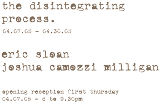 This body of work is an examination of some of the different expressions of the disintegrating process. This process, which is one basic component of life itself, acts in some degree as its own abstract entity, seemingly unending and without containment or constraint. In essence, the disintegrating process poses a vital question about life itself, and presents moral dilemmas in regard to our ability to increase or decrease the relative speed of this process on all levels both within ourselves and the world around us. At which point do we pass these thresh-holds of indifference toward consciously attempting to control what seems to be uncontrollable for the long term sustainability of our species? Instinctually, are we collectively preparing ourselves to survive the journey to what seems to be an unknown destination amidst a black and endless sea of chaos?