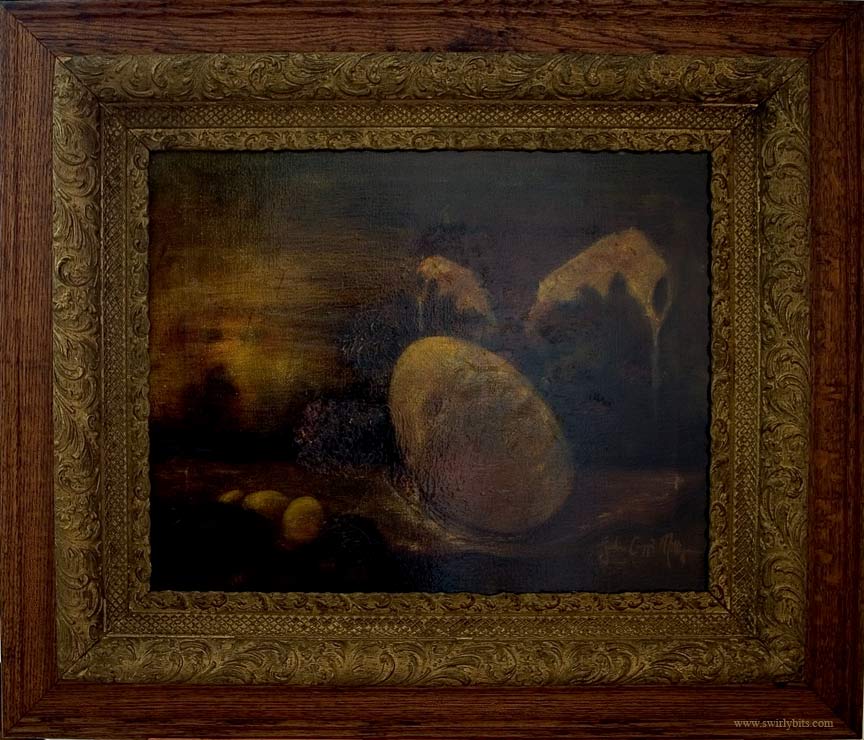 appologies for the glare.... too much varnish.... will attempt better documentation later ... 16'' x 19"......oil on appropriated canvas